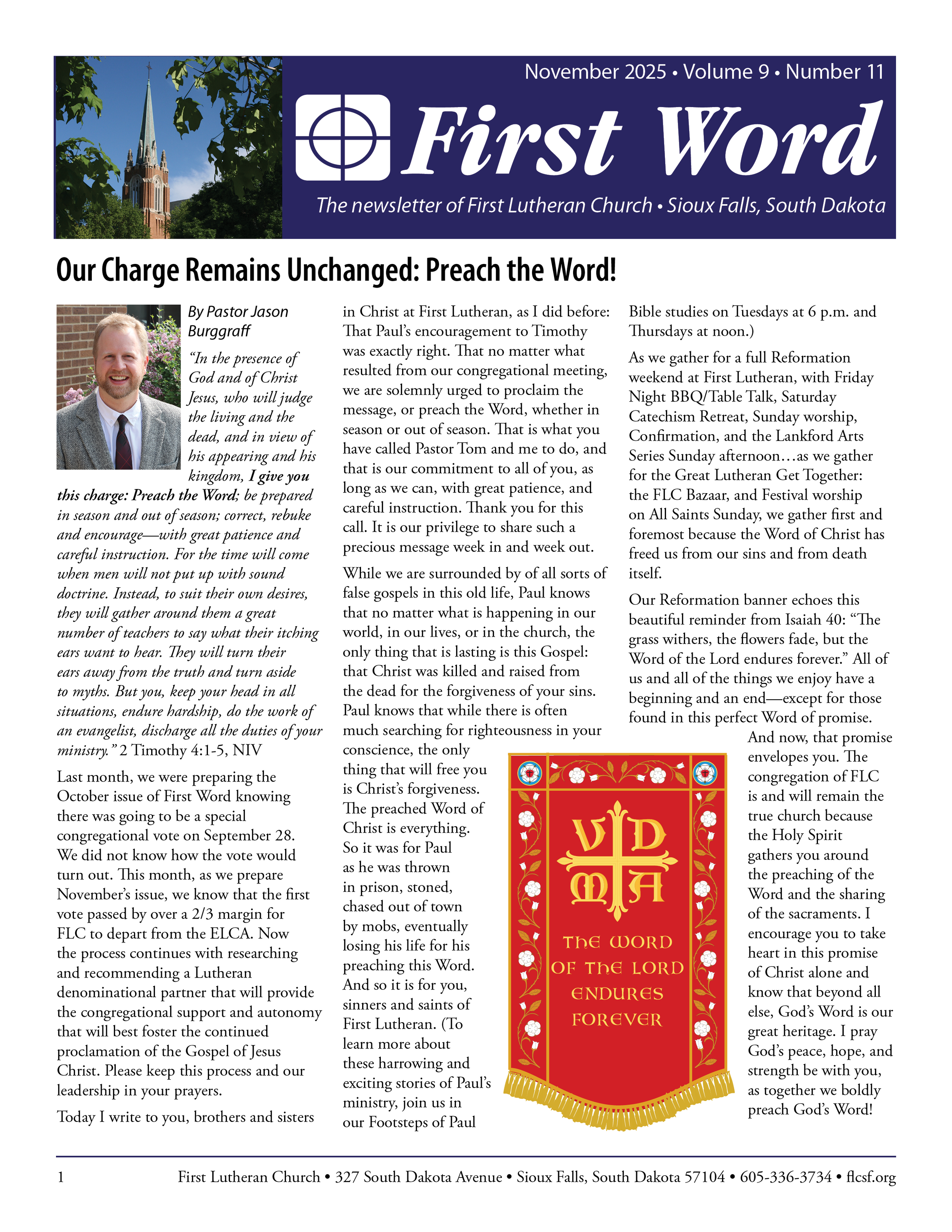 First Word is the monthly newsletter of First Lutheran Church in Sioux Falls, SD. It is distributed to members of the congregation and others upon request. First Word is available to read online, via email, or U.S. mail. Stay in touch with what's happening in the First Lutheran faith family. Sign up below.